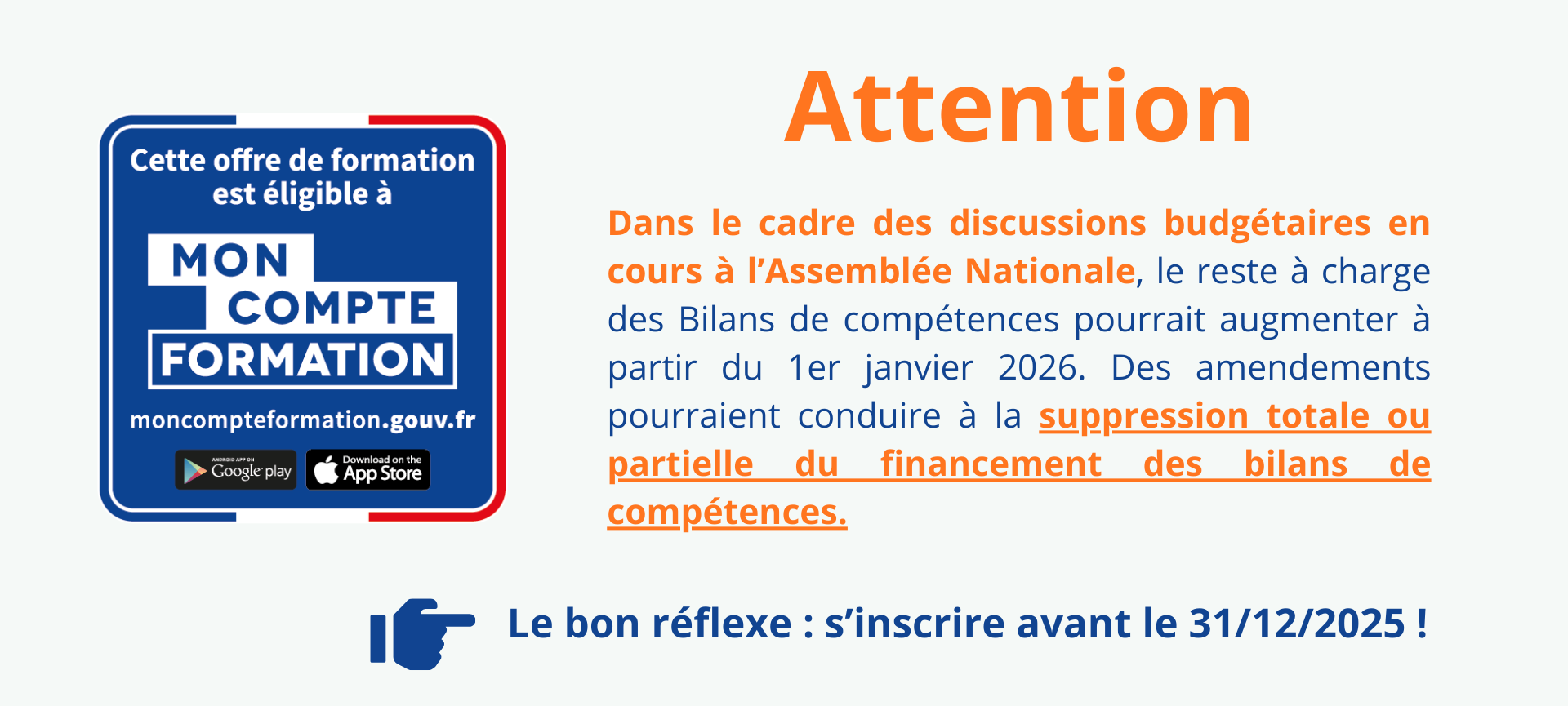 En outre, je collabore avec une psychologue du travail ou un coach certifié pour les tests psychologiques dans le cadre des Bilans de compétences : afin de bénéficier d’un regard pluriel nécessaire à la démarche de Bilan.